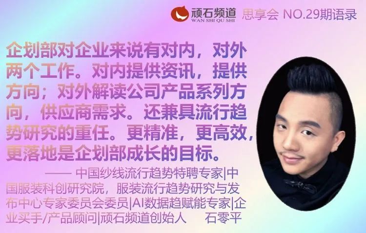 —— 中国纱线流行趋势特聘专家|中国服装科创研究院,服装流行趋势研究与发布中心专家委员会委员|AI数据趋赋能专家|企业买手/产品顾问|顽石频道创始人石零平